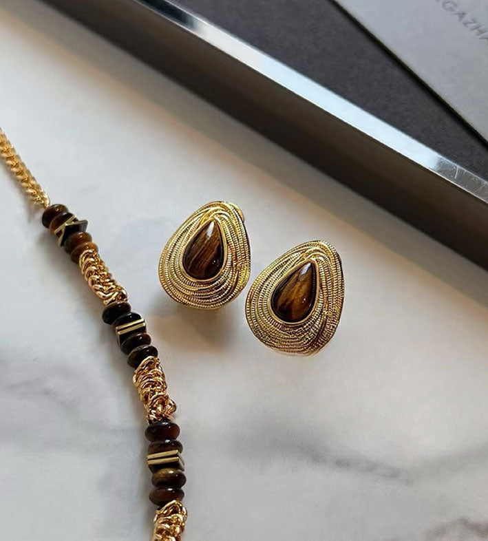 The rich, warm hues of the tiger's eye stones are complemented by the elegant setting, creating a striking contrast that is sure to turn heads. The intricate design of the earrings adds a touch of sophistication and glamour to any outfit, whether it's a casual day out or a formal evening event. The Miraad tiger's eye earrings are not only a beautiful accessory, but they also carry the powerful energy and symbolism of the tiger's eye stone, known for its protective and grounding properties.