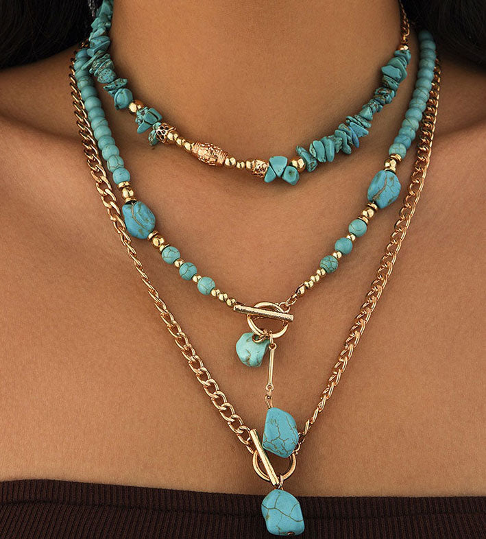 The pendant features an imitation turquoise pattern with tassel details, exuding a bohemian vibe. Its multi-layered design incorporates elements of Persian style, creating a unique and unconventional aesthetic. The geometric shapes and intricate patterns add a touch of individuality to the piece, making it a standout accessory.