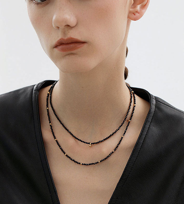 The natural black spinel layered necklace with a versatile and sophisticated small gold ball clavicle chain. This exquisite piece is perfect for adding a touch of elegance to any outfit. The layers of black spinel stones create a stunning and luxurious look, while the small gold ball clasp adds a subtle yet stylish detail. Whether worn alone or layered with other necklaces, this necklace is sure to elevate any ensemble with its timeless appeal.